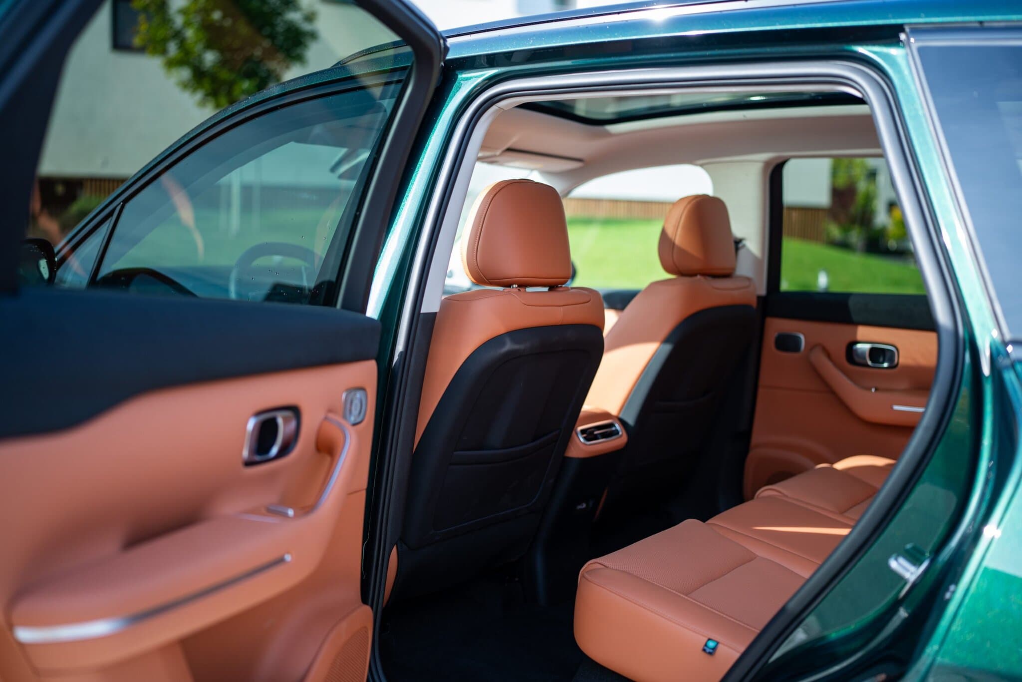 Kabína C10 pôsobí nadpriemerne priestranne (rovná podlaha, vzadu dosť miesta na kolená aj hlavu). Predné sedadlá sa dajú sklopiť do „lôžka“ – áno, marketing to volá „double bed“ – a v spojení s panoramatickým sklom z toho vie byť detský kemping v daždi. A keď dážď chýba, infotainment vie v režime „Nap Mode“ sklopiť sedačky a spustiť zvuky prírody, vrátane spomínaného dažďa. O komfortné sedenie sa v testovanej verzii starajú vyhrievané a ventilované kožené sedačky s certifikátom EOKO TEX, ktoré sú aj dostatočne široké, no vyšší vodiči by uvítali možnosť predĺženia stehennej podpory. Keď sme pri tých materiáloch, ich spracovanie je dostatočne dobré, aby vám pod rukami nič nevŕzgalo no ich samotná kvalita vám napovie, že prémiový segment je ešte o kúsok ďalej.
