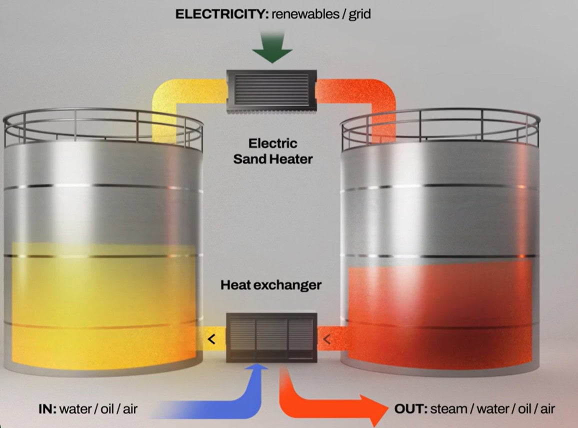 Následne sa ukladá do samostatného zásobníka s horúcim pieskom, v ktorom sa energia efektívne uchováva. Keď výroba potrebuje paru alebo teplo, piesok sa preženie cez externý výmenník tepla, ktorý dodá energiu priamo do výrobného procesu. Podľa firmy je účinnosť prenosu tepla až desaťnásobne vyššia než pri klasických statických systémoch.
